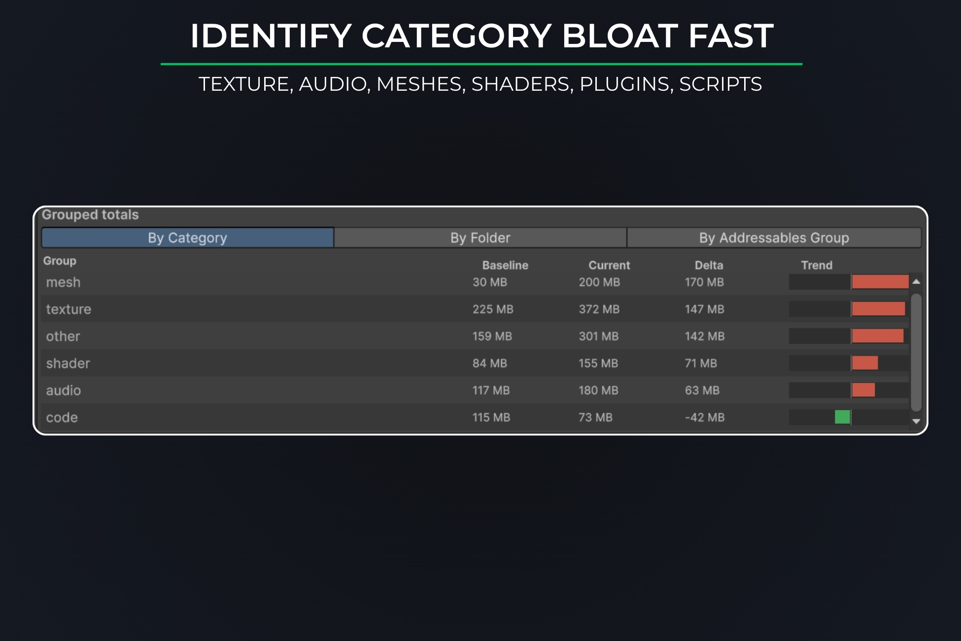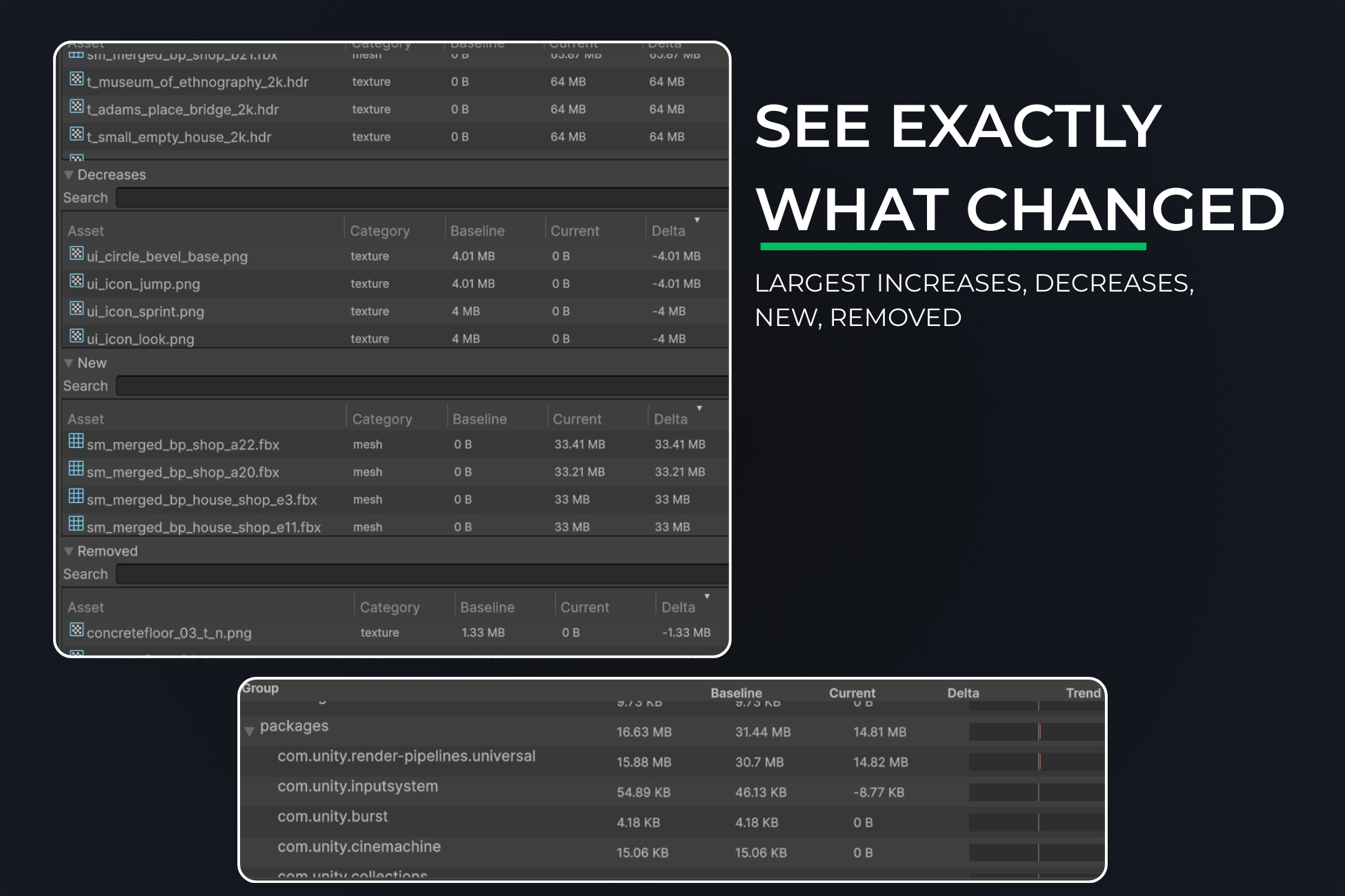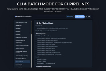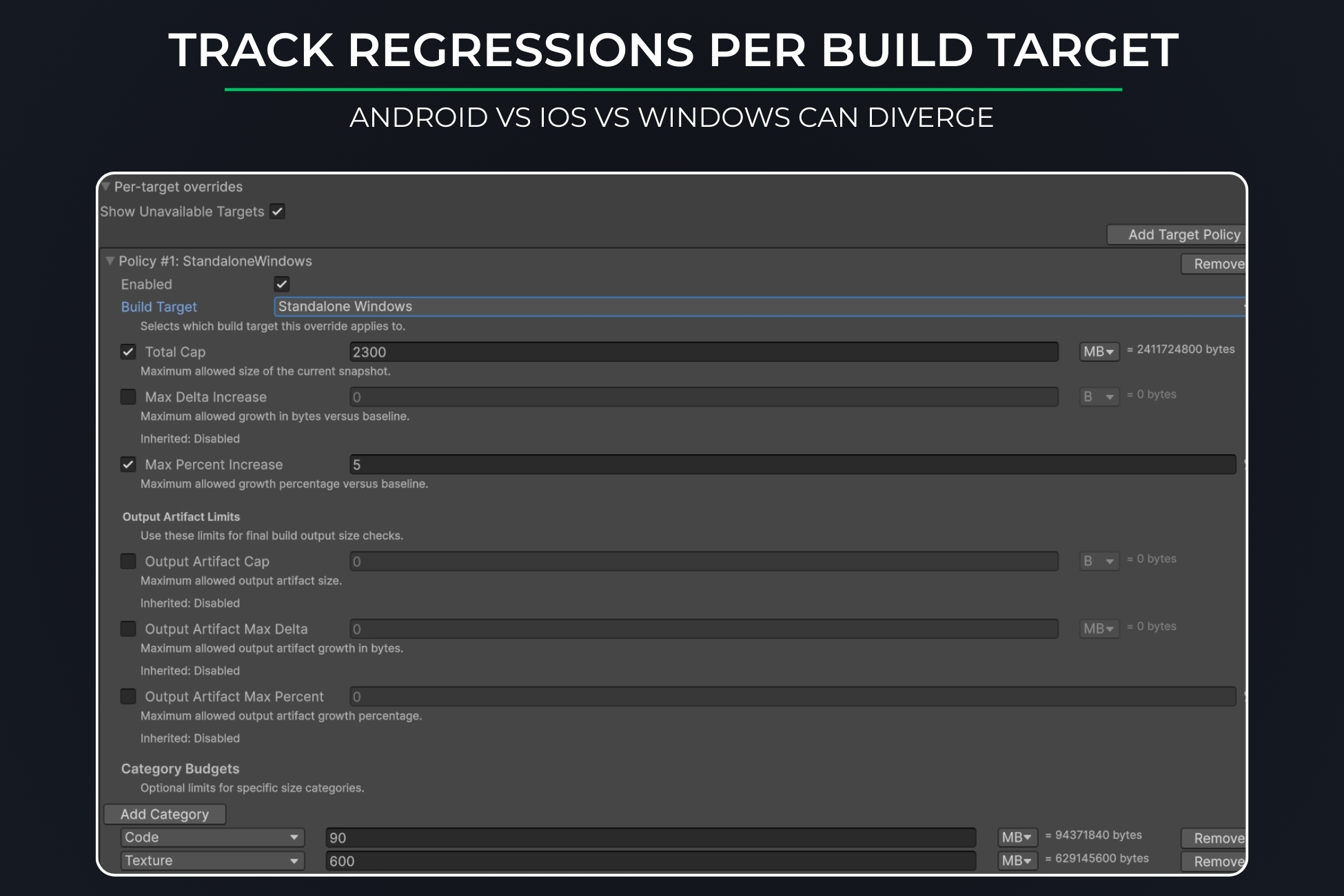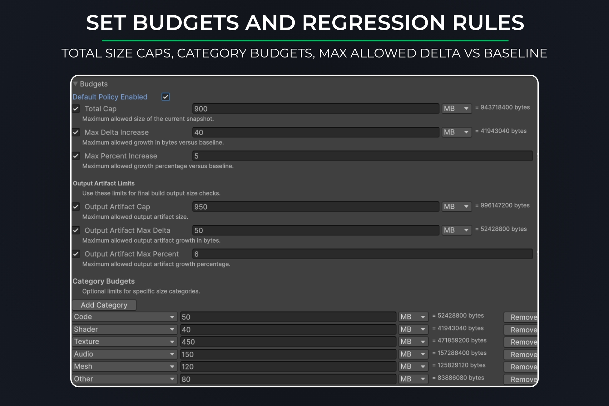Build Size Guard is a Unity Editor tool for build size regression control, not just another “build report viewer”. It treats build size like a tracked metric with snapshots, diffs, and budgets you can enforce in both local workflows and CI pipelines.