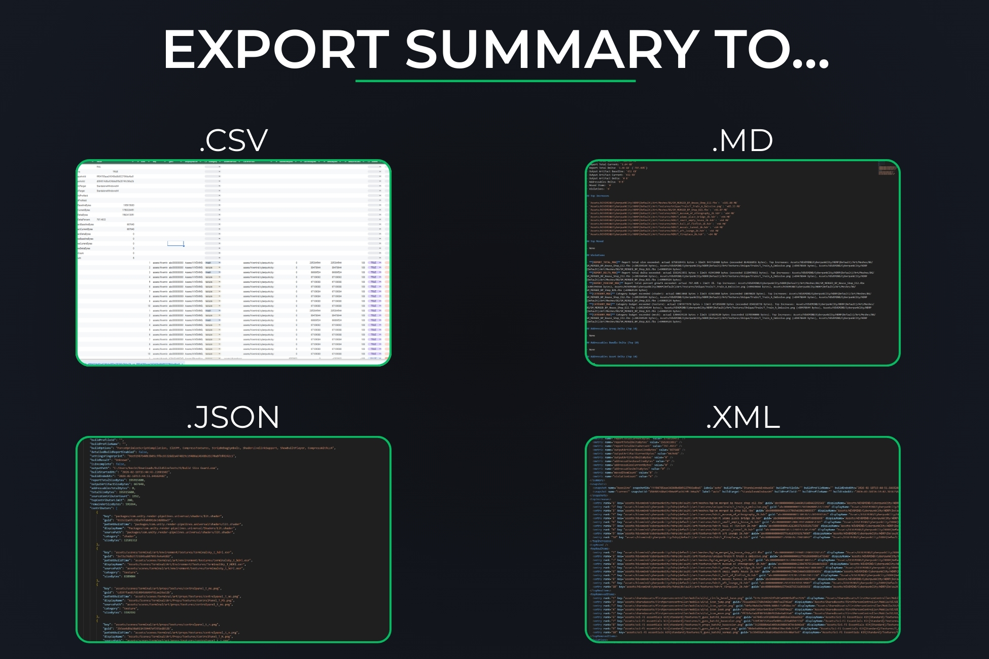 Stores versioned, VCS and CI friendly JSON with labeled size metrics and contributor breakdowns (GUID preferred where available).