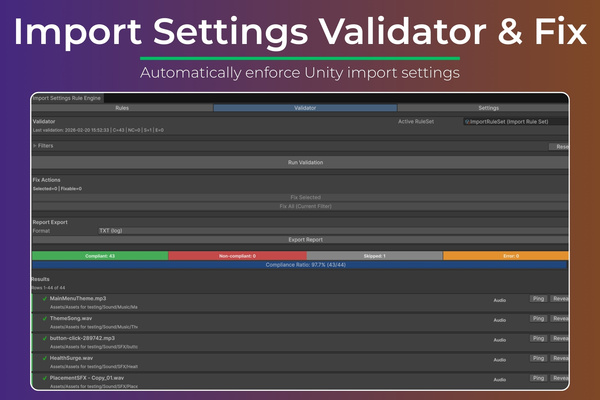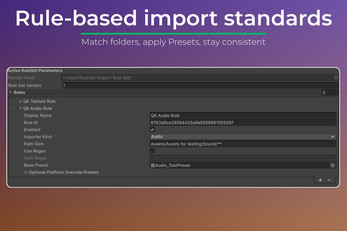 Import Settings Rule Engine keeps your project’s import settings consistent across Textures, Audio, and Models. Define your standards once using simple rules, and the tool makes sure every matching asset follows them automatically.