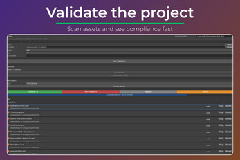 You can also scan the entire project at any time. The Validator shows which assets are compliant and which are not, grouped by type. For each asset, you can see which rule matched and what settings differ. Fix selected items or fix everything in the current view, with confirmation before changes are applied.