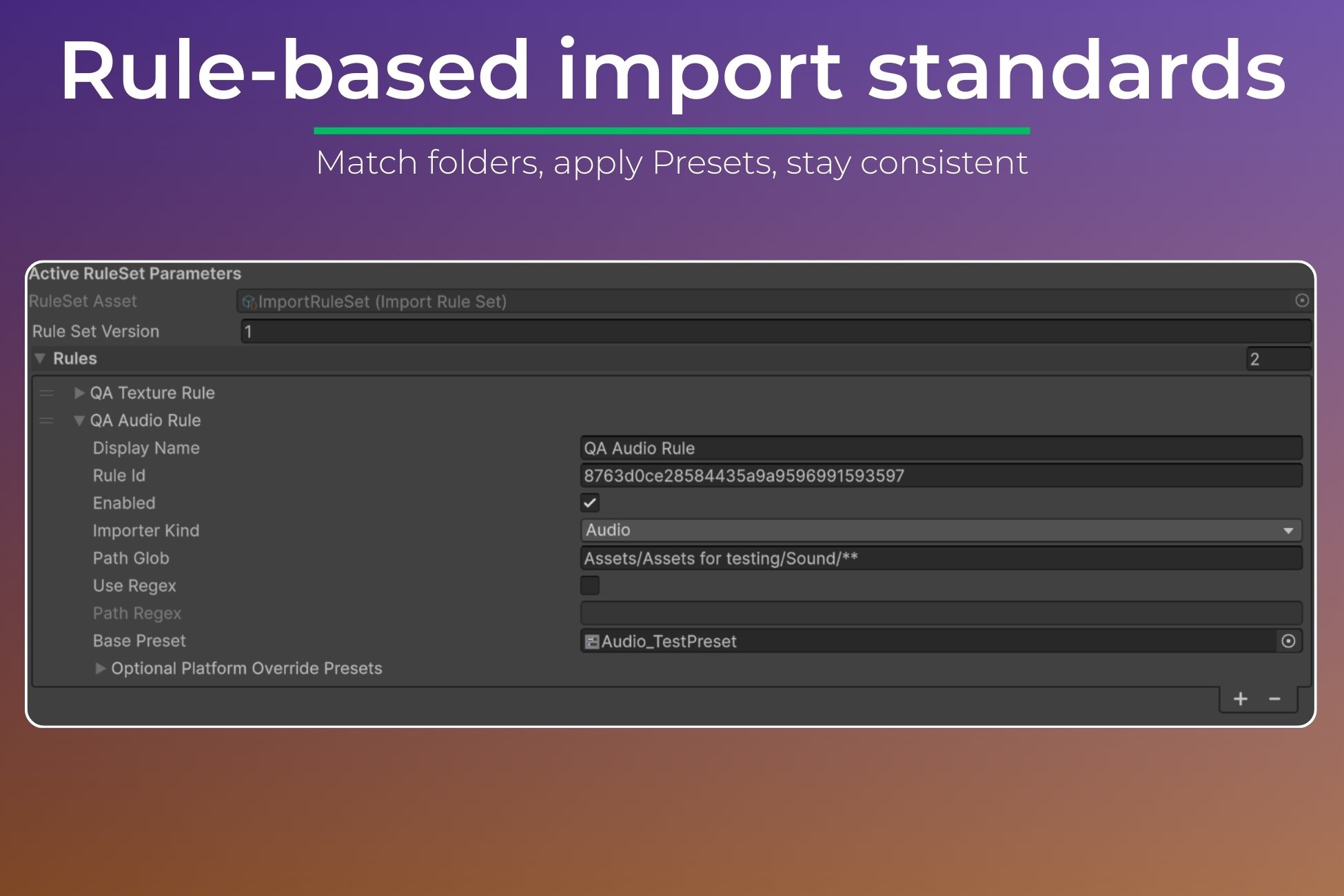 Create rules based on folder paths and asset type, then link each rule to a Unity Preset. From that point on, every new import or reimport is checked and corrected if needed. This prevents drift, reduces manual setup, and keeps teams aligned without constant oversight.