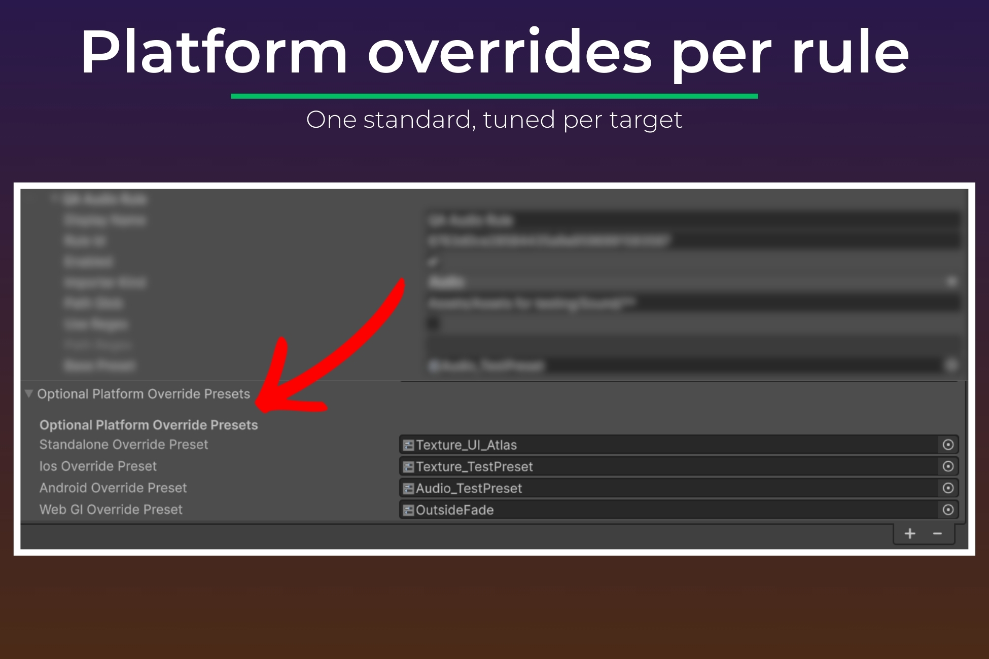 This version supports Textures, Audio, and Models. Rules are edited in the Inspector and use standard Unity Presets. The tool enforces the standards you define. It does not automatically guess optimal settings. It runs in the Editor only and does not add runtime code.