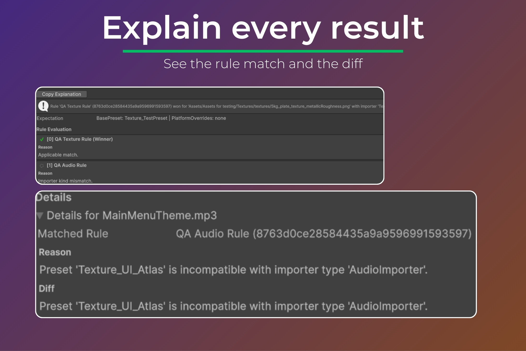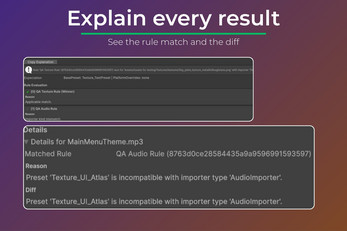 A dry run mode lets you preview what would change before enforcing it. The tool only reimports assets when settings actually differ, avoiding unnecessary processing. Clear logging and a simple Explain view make it easy to understand why a rule applied.